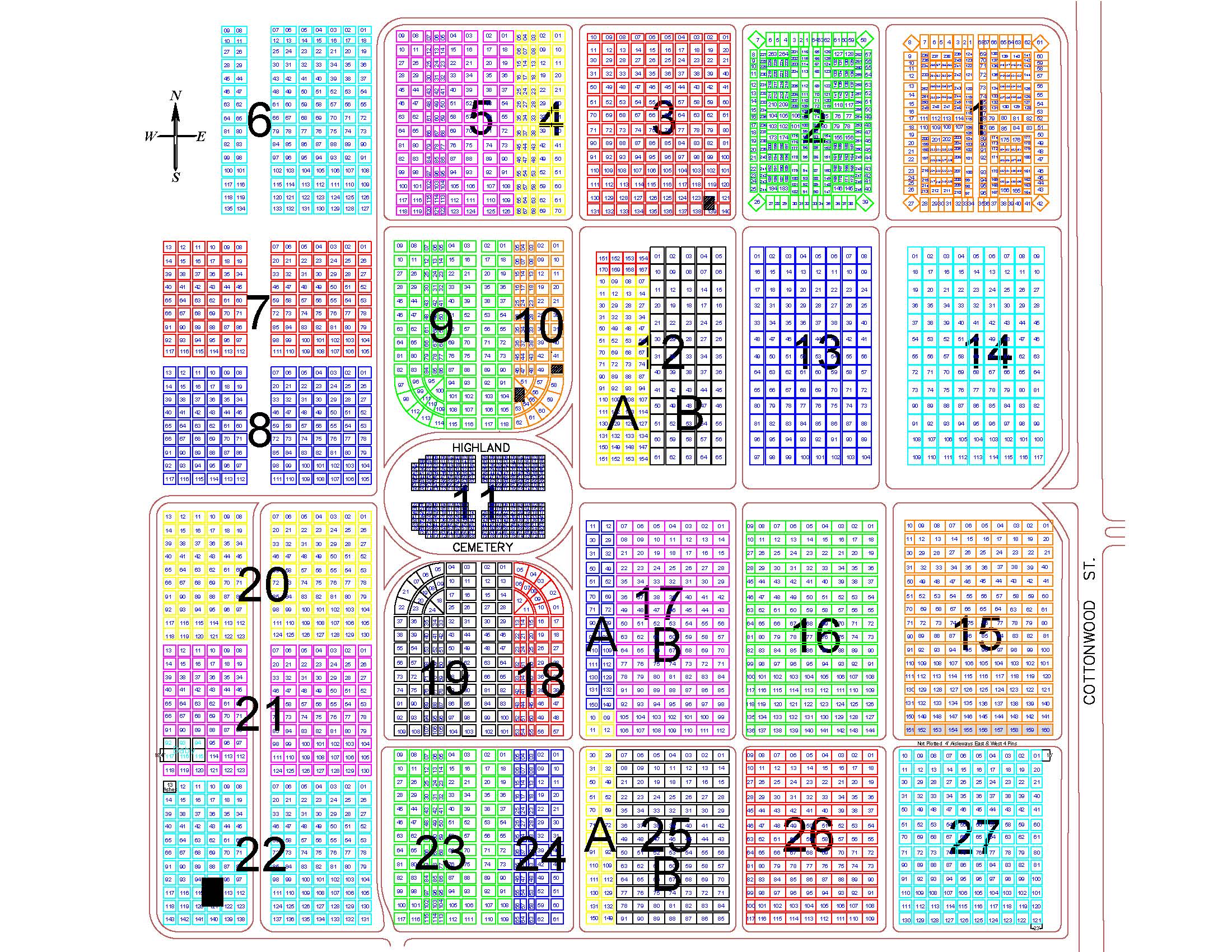 Directions on How to Use & Understand This Map - The Highland Cemetery map is divided by sections numbered 1 thru 27 and these areas are commonly known as individual blocks. The smaller numbers inside each of the individual blocks in commonly known as lots. When searching for an individual from the Highland Cemetery list of burials this map will display for the user the Block and Lot numbers only and not the individual space numbers!